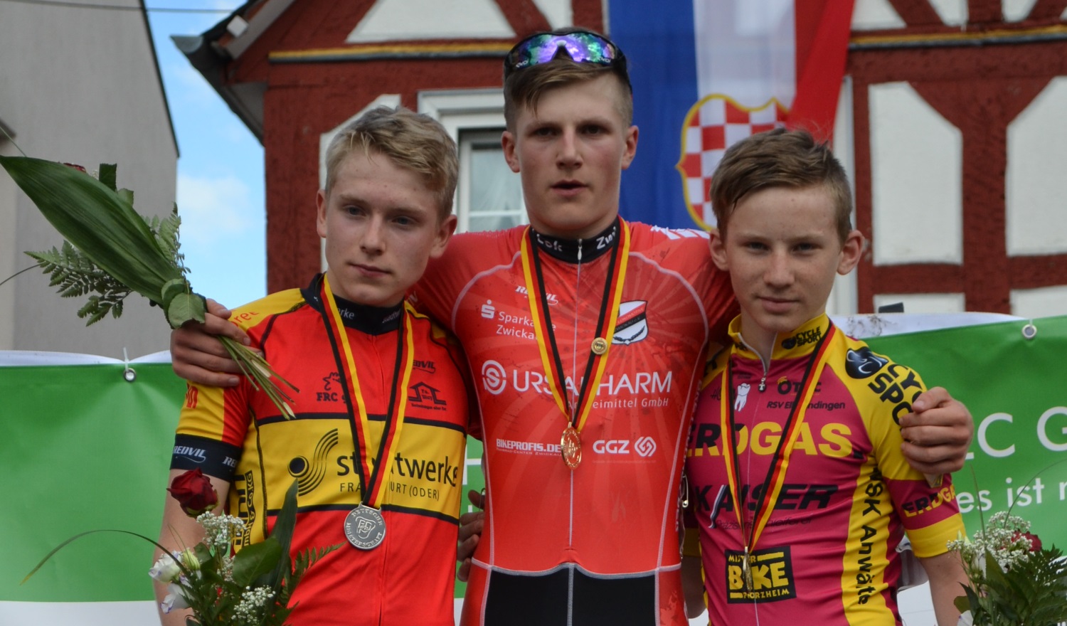 Wie bereits 2015 wurden die Deutschen Straßen-Meisterschaften der Nachwuchsklassen U15m/w bis U19m/w im hessischen Nidda ausgefahren. Mit dabei waren die Ellmendinger Akteure Julius Klein (U19), Maximilian Boos (U17), Katharina Becker (U17w) sowie Benjamin Boos und Plinius Naldi (beide U15). Rund 150 Sportler der Klasse U15 hatten den welligen, 22,8 Kilometer langen Kurs zweimal zu absolvieren. Da sich im Rennen keine Fahrer absetzen konnten, sprinteten fast 90 Pedaleure um den Sieg. Die schnellsten Beine hatte dabei Laurin Drescher aus Zwickau. Dahinter musste sich Naldi nur knapp Roman Duckert (Frankfurt/Oder) geschlagen geben und gewann Bronze. Sein Teamkollege Benni Boos fuhr mit der gleichen Zeit wie der Sieger auf Position 44 ins Ziel, nur sechs Kontrahenten des jüngeren Jahrgangs 2003 waren schneller als er. Eine Runde mehr hatten die U17w zu absolvieren. Sie kam in der Verfolgergruppe von vier Ausreißerinnen ins Ziel und belegte einen guten 16. Platz. Großes Pech hatten Julius Klein und Maximilian Boos. Klein musste nach wenigen Kilometern mit defektem Schalthebel das Rennen beenden und Boos wurde in Runde eins in den Straßengraben abgedrängt. Nach eine Aufholjagt über 20 Kilometer kam er wieder an das Feld heran, eine vordere Platzierung war nach diesem Kraftaufwand jedoch nicht mehr möglich.
