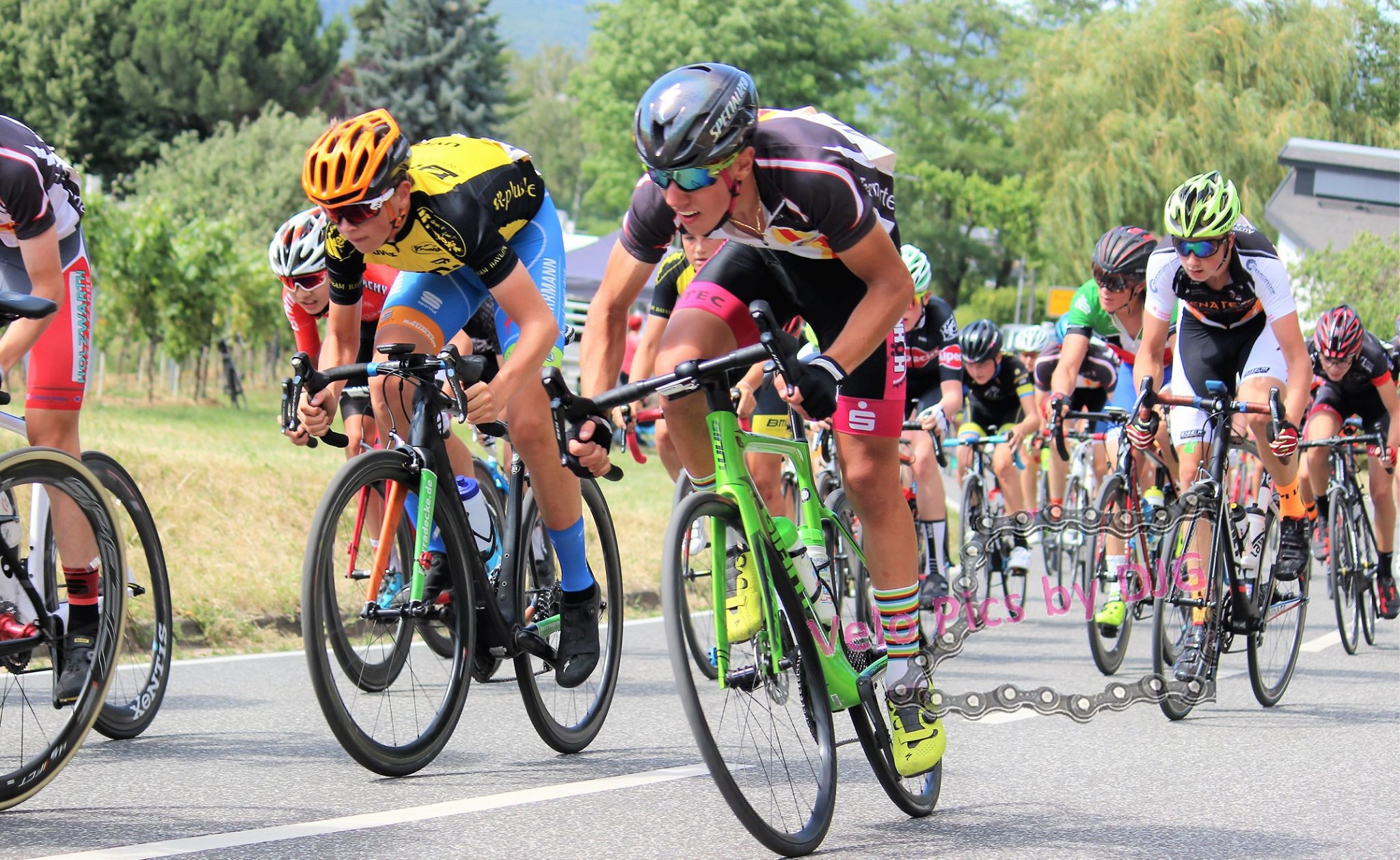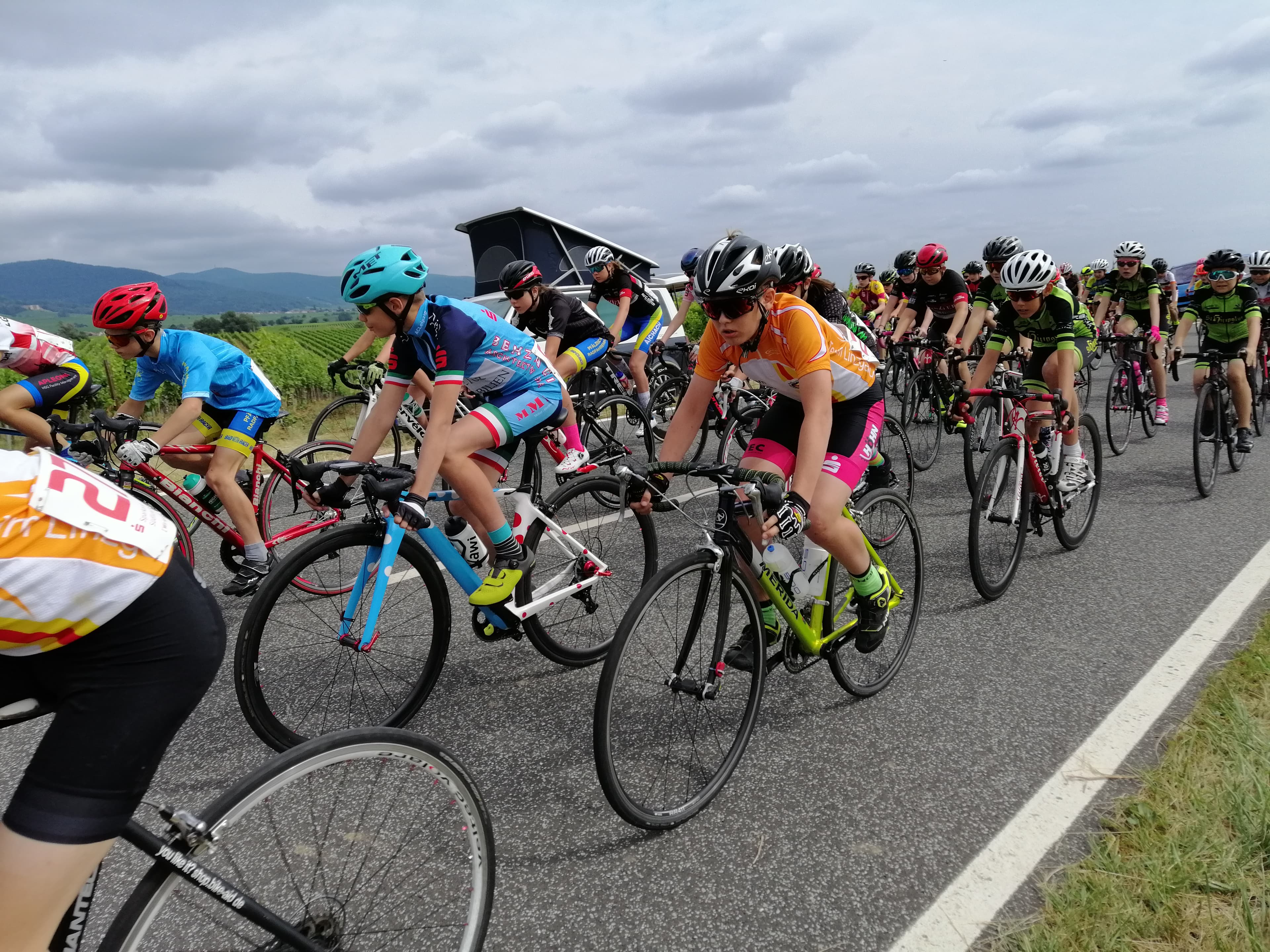 Am Wochenende stand mit der Südpfalztour wieder einer der Saisonhöhepunkte für die Schülerfahrer und -fahrerinnen der U13 und U15 an. Die vom Radsportbezirk Südpfalz organisierte Tour bietet den Nachwuchsfahrern traditionell eine tolle Möglichkeit erste Tourerfahrung wie die Großen zu sammeln. Der besondere Flair für die jungen Sportler zeigte sich schon dadurch, dass die Mannschaften nicht nur aus ganz Deutschland sondern sogar aus Belgien und Frankreich angereist waren und das Starterfeld daher mit über hundert Fahrern deutlich größer war, als bei den gewohnten Rennen. Zudem war mit Pascal Ackermann ein prominenter Ehrengast vor Ort, der mit seiner netten Art nicht müde wurde, Autogrammwünsche zu erfüllen und sich immer wieder bereitwillig für gemeinsame Fotos zur Verfügung stellte.