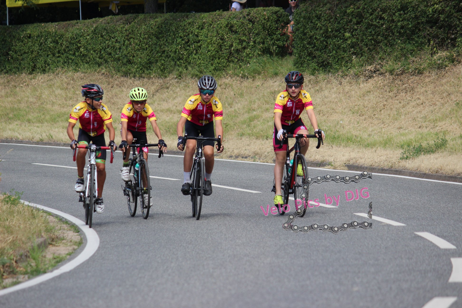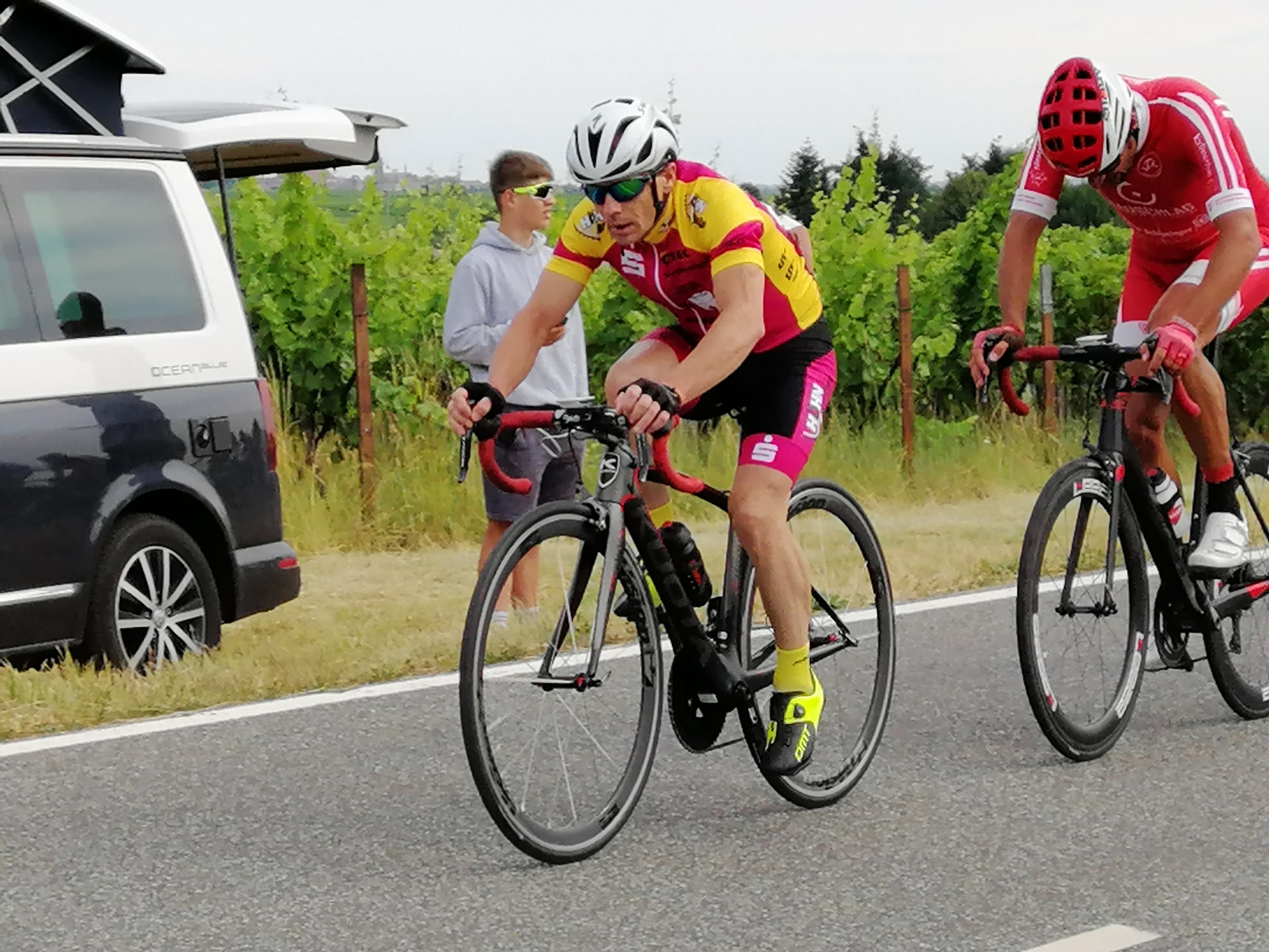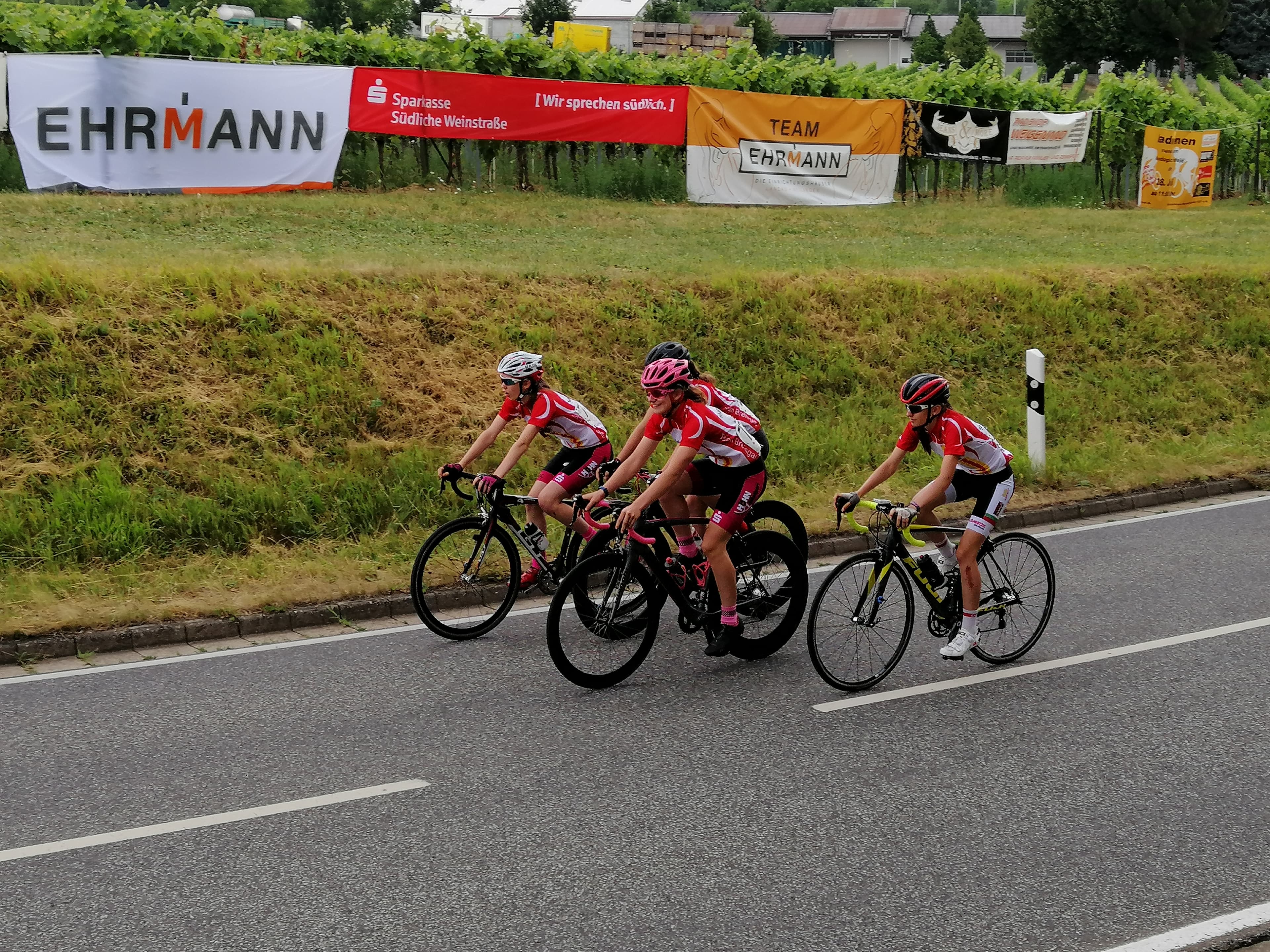 Gestartet wurde am 05.07.2019 mit der ersten Etappe in Scheibenhardt. Im Einzelzeitfahren ging es für alle im 30 Sekundenabstand auf den 5,5 km langen Kurs. Hier galt es jede Unachtsamkeit zu vermeiden, kostete doch jede Abweichung von der Ideallinie wertvolle Sekunden. Am Samstag folgt dann die zweite Etappe mit einem Rundstreckenrennen in Roschbach. Die 3,8km km lange Runde durch die Weinberge, die von den Fahrern mehrfach zu bewältigen war stellte aufgrund des heißen und gleichzeitig windigen Wetters sicher eine Herausforderung für die Fahrer dar. Den Abschluss der Südpfalztour bildete der Sonntag mit dem Rennen über die traditionelle und anspruchsvolle Runde (6,3km) des großen Preises der Sparkasse Südliche Weinstraße in Roschbach. Hier wurde das Rennen der U15 von einem Massensturz überschattet, den unsere Fahrer zum Glück ohne Beteiligung umgehen konnten.