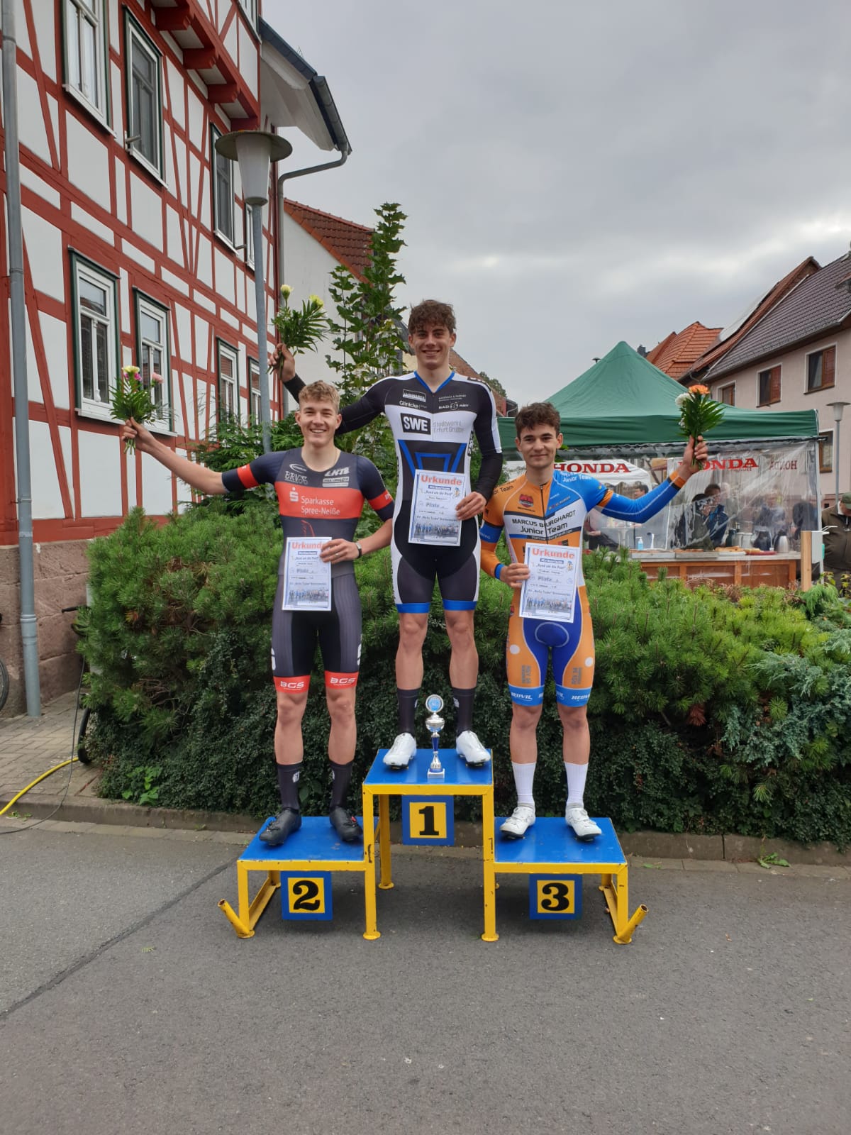 Im thüringischen Breitenworbis ging es am Sonntag “rund um die Post”. Auf dem 1,3km langen Rundkurs ohne nennenswerte Anstiege wurden Kriteriumswettbewerbe für die Altersklassen U11 bis U19 ausgetragen. Im letzten Rennen des Tages kämpften 32 Junioren, von denen nahezu die Hälfte aus Thüringen stammten, 50 Runden lang um den Sieg – Benjamin Boos, der auch nach den Europa- und Weltmeisterschaften auf der Bahn weiter in Bestform ist, hatte die Nase vorn und verwies seine Konkurrenten auf die Plätze. Große Freude beim RSV-Mitglied über diesen kleinen Erfolg beim Straßen-Comeback nach vielen Bahn-Kilometern.