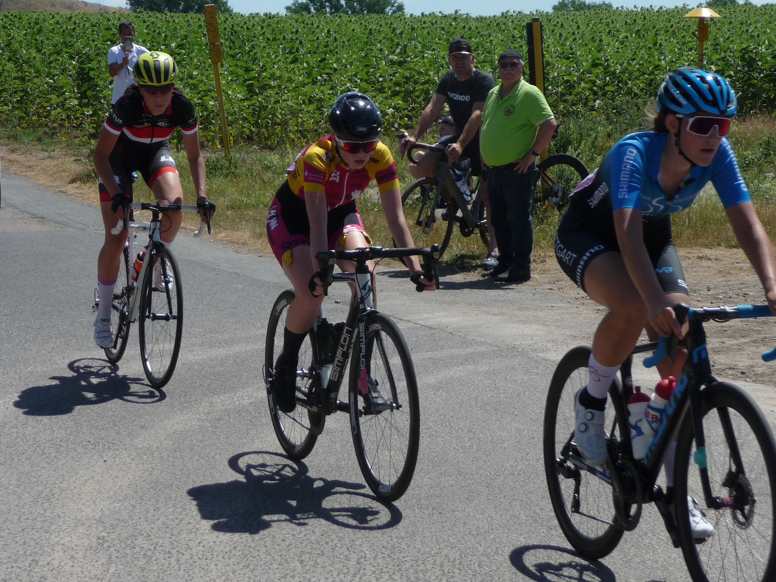 Top vorbereitet von Trainer Wolfgang Schendzielorz und hoch motiviert nahmen Aaron König, Fabrice Gremmer und Marvin Witt die 7 Runden gleich 71km in Angriff. In der dritten Runde kam es dann zu einer ersten Tempoverschärfung in der Anfahrt zum Anstieg in Witterda und einem Massensturz im vorderen Drittel des Feldes. Leider waren darin auch Aaron und Fabrice verwickelt. Der spätere Sieger Paul Fietzke nutze die Verwirrungen, attackierte am Berg und fuhr fortan ein einsames Rennen an der Spitze. Die erste Verfolgergruppe mit 16 Fahren wurde taktisch clever den Vereinskameraden kontrolliert und konnte den Spitzenreiter nicht mehr einholen. Gezeichnet von den Stürzen nahmen Fabrice in einer zweiten und Aaron in einer dritten Gruppe die Verfolgung auf. Mit einer Einzelattacke in der vorletzten Abfahrt führte Aaron die beiden Verfolgerfelder wieder zusammen und es kam letztendlich zu einem Massensprint um die Plätze 17 bis 61. Aaron wurde als 37. und Fabrice als 38. Gewertet. Marvin fuhr ein gutes Rennen, musste aber in der vierten Runde abreißen lassen und wurde letztendlich wie weitere 44 Fahrer aus dem Rennen genommen.