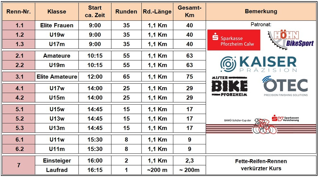 Der Start zum ersten Rennen ist um 09:00 Uhr mit den Rennen der Elite Frauen, Juniorinnen und männlichen Jugend geplant. Das Hauptrennen Elite-Amateure über 75km verteilt auf 65 Runden ist für ca. 12:00 Uhr vorgesehen.